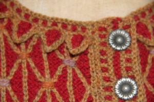 Detail Halsausschnitt und Vorderkante mit angestrickter Blende.