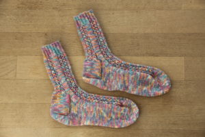 Ich habe ein Karokleid in den Farben und weil ich, wie bereits erwähnt, gerne Stricksocken in passenden Farben trage, ist meine Wahl auf diese Sockenwolle der Marke «Gründl» gefallen. (Hot Socks print). Ein einfaches Lochmuster bei dem 1 Masche über 2 Maschen gehoben wird und in der Runde drüber dann mit einem Umschlag ersetzt wird ergibt das Muster.