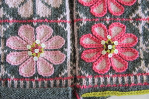 Während ich am stricken der Ärmel arbeite, bin ich auch am ausprobieren der Stickerei. Die erste Farbkomination (pink) hat mich einfach nicht restlos überzeugt und so habe ich eine 2. Variante gestickt