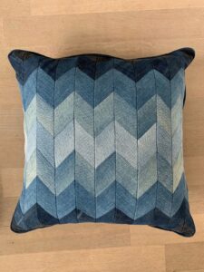 Die Stoffe sind aus 4 verschiedenen Jeanshosen zusammen gestellt. In die Kanten habe ich Passepoiles genäht, gibt etwas mehr Arbeit, aber damit wird die Kantenform besser. Auch lasst sich bei dicken Stoffen das Kissen nach den Zusammennähen besser wenden.